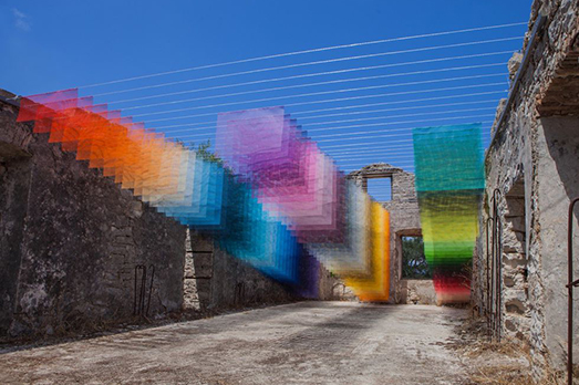 In programma un viaggio in Grecia? Non potete fare a meno dell’arte nemmeno in vacanza? Sull’isola di Paxos è iniziato il Paxos Contemporary Art Project, evento che porta nella piccola isola greca un gruppo di artisti internazionali come Axel Void, Jewgeni Roppel, Leonid Keller, Linus Lohmann, Quintessenz Creation, Rene Wagner, Michael Sebastian Haas e Yiannis Pappas. Il lavoro più suggestivo è proprio quello di Quintessenz: una serie di strati di tessuto di 120 tonalità di colore differenti tagliate in forme geometriche e poi sospese seguendo una griglia prospettica. Il risultato è un arcobaleno che si innesta all’interno di un edificio in pietra abbandonato risalente a 400 anni fa, nel piccolo villaggio di Kagatika.