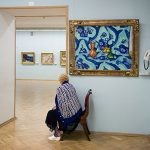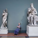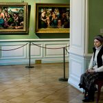 Fotografare le opere d’arte è oramai un’abitudine diffusa da molto tempo, in Italia anche prima del 2014, anno in cui Franceschini abolì il divieto di scattare foto nei musei. Impossibile però non considerare i lati negativi, e infatti il dibattito sulla questione rimane aperto, tra problemi di copyright, disturbo per gli altri visitatori, uso del flash e via dicendo. Certo è che tra i cosiddetti “turisti digitali” dovrebbe prevalere il buon senso, soprattutto quando si pensa alle stanze affollatissime dove centinaia di persone assalgono con le loro macchinette, smartphone o simili, grandi capolavori come la Gioconda o la Ronda di Notte di Rembrandt. Andy Freeberg invece ha preferito fare tutt’altro, fotografando le persone di guardia nelle sale di due dei musei più celebri del mondo: l’Hermitage di San Pietroburgo e il Puškin di Mosca. Protagoniste della serie Guardians sono donne che, senza divisa ma con i loro abiti di tutti i giorni, rimangono sedute per ore accanto ai grandi capolavori dell’arte. Persone e quadri sembrano fondersi insieme con l’ambiente circostante, creando nuove e inaspettate composizioni. Quando Freeberg espone i suoi lavori stampa le foto a grandezza naturale, proprio per fare immergere ancora di più l’osservatore in queste sale e mettendo così l’accento non solo sulle opere e la storia di un Paese, ma anche sul nostro rapporto con l’arte e la nostra percezione dello spazio. (NG)