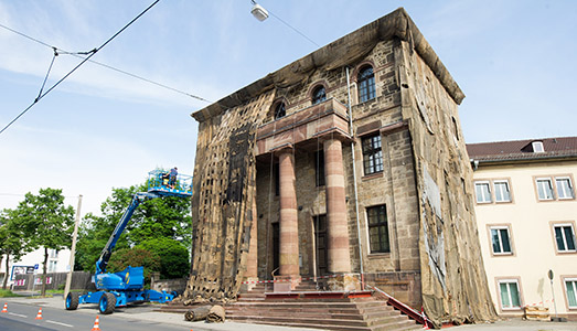 Questo che vedete nelle foto è il Torwache di Kassel, o meglio, quello che rimane oggi di un progetto di costruzione di un edificio palaziale ideato dell’architetto Heinrich Christoph Jussow, interrotto nell’Ottocento a causa delle guerre napoleoniche. In occasione della quattordicesima edizione di documenta l’esterno dell’edificio è stato avvolto interamente da brandelli di sacchi di juta cuciti insieme per l’installazione site – specific di Ibrahim Mahama. Nato in Ghana nel 1987, Mahama si serve di sacchi che sono stati usati dai commercianti del suo paese d’origine per l’esportazione di materie prime verso l’America e l’Europa, come testimonianze tangibili della storia del commercio globale e dell’economia capitalistica. Forse alcuni ricorderanno l’intervento dell’artista alla Biennale di Venezia di Okwui Enwezor, che aveva coinvolto il lungo corridoio che conduce i visitatori fuori dall’Arsenale. Nelle numerose installazioni di Mahama, musei, edifici governativi, ministeri, teatri e stazioni ferroviarie vengono avvolti con sacchi cuciti precedentemente con l’aiuto di gruppi di persone, trasformandosi poi in spazi con altre caratteristiche, a cui vengono imposti nuovi significati e nuove forme. Il Torwache, al cui interno sono state allestite le opere di Oskar Hanses, Edi Hila, Annie Vigir & Frank Apertet e Lois Weinberger è sicuramente l’installazione che, insieme al Partenone di libri di Marta Minujín, colpisce di più in questa documenta14, a un primo sguardo un po’ assopita, o forse, ancora da scoprire pian piano. (NG)