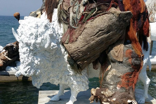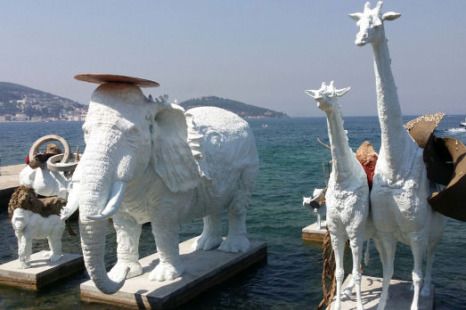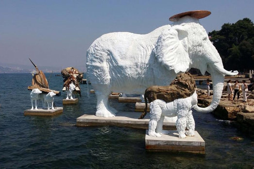 Adrian Villar Rojas ha realizzato uno zoo visionario e splendente, le cui figure – elefanti, giraffe, ippopotami – si stagliano, bianchissime e con sopra altri animali, sul blu del mare. È una potente e vibrante installazione. La più bella vista finora a Istanbul.
