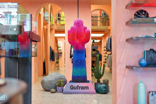 Eccolo il masterpiece di Gufram, azienda che quest’anno compie mezzo secolo di attività e che ha festeggiato mettendo in scena con un allestimento quasi psichedelico, da Sozzani, i suoi cavalli di battaglia: il divano Bocca di Studio65, il Pratone di Giorgio Ceretti, Pietro Derossi e Riccardo Rosso, il Sasso e Sedilsasso dell’artista Piero Gilardi, Globe del duo Studio Job, fino appunto al grande Cactus disegnato da Guido Drocco e Franco Mello, che da Paul Smith è in vendita a 5mila euro, tiratura 69 esemplari multicolor.