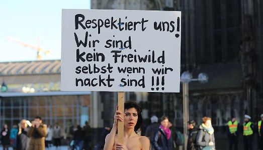 Stavolta, dopo le fotografie con i turisti (e l’arresto) davanti alla Tour Eiffel o ad Art Basel, Milo Moire colpisce nel cuore della Germania, davanti alla Cattedrale di Colonia, vicino a quella stazione ferroviaria dove, la notte di Capodanno, decine di donne sono state bersaglio di violenze e molestie da parte di un gruppo di uomini, molti dei quali avevano chiesto anche asilo politico alla Germania.