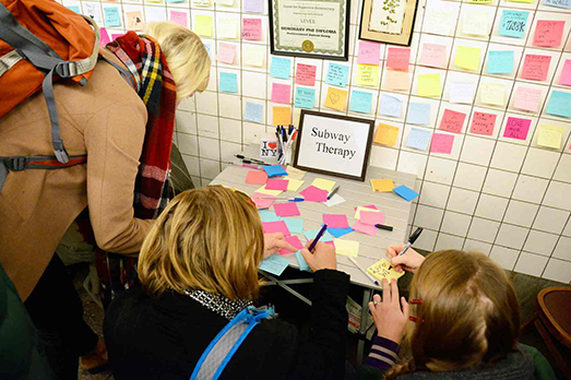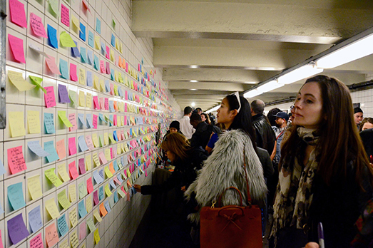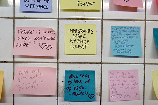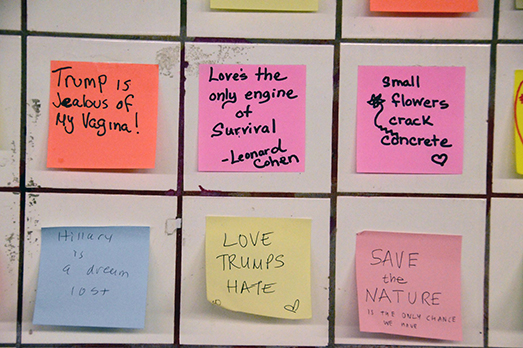 Poi però ci sono proteste meno urlate e che forse alla fine funzionano anche di più. Matthew Chavez, street artist americano meglio conosciuto come Levee, nella metropolitana tra la 6th Avenue e la 14esima strada ha realizzato la “Subway Therapy”: un muro di post-it dove ciascuno può esprimere pensieri, sentimenti, rabbia post Trump. La gente, non solo giovani, sta partecipando attivamente. Ne viene fuori il ritratto di un popolo che non urla e non si riconosce. Ma che, almeno per ora, non molla.
