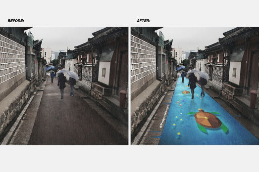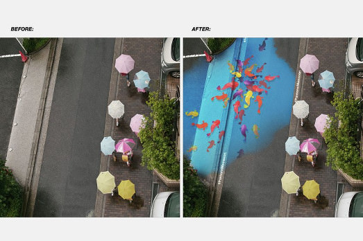 Ma ora si cambia musica. Un gruppo di designers di Seoul ha messo a punto The Monsoon Project, pensato apposta per chi teme la pioggia come la peste e si deprime solo a pensarla. L’idea è geniale ed efficace. Usando una particolare pittura i cui colori si attivano con l’acqua, realizzano della street art che letteralmente reinventa le strade. Pesci, balene, colorata fauna marina miracolosamente fluttuano per strada.