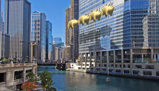 Si tratta di un rendering, perché dal vivo chissà se mai vedremo quest’installazione completata. Si tratta di un nuovo, un altro ancora, colpo di coda “sociale” nei confronti del neo Presidente Donald Trump. Stavolta lo sberleffo viene dallo studio di progettazione New World Design, che per il fiume di Chicago ha ideato appunto Flying Pigs on Parade: a Chicago River Folly, ovvero un’installazione metropolitana composta da quattro belle sagome di maiali paffuti e dorati che, secondo i piani, dovrebbero coprire proprio il logo di Trump (sei metri di lettering) dall’edificio di sua proprietà affacciato sul fiume della città dell’Illinois.