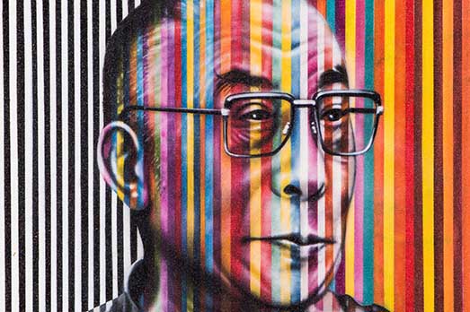 I suoi temi sono per lo più politici, affidati a volti-icone della nostra epoca. Da John Lennon a Mandela, il Dalai Lama passano per Dalì.