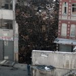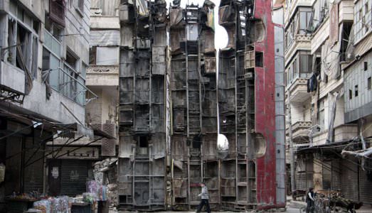 Non è un’installazione di Doris Salcedo, l’artista colombiana che trasforma luoghi e ambienti accumulando mobili e carcasse di mobili. Qui è tutto vero, e siamo a Aleppo, una delle città più antiche del mondo dove, per proteggersi dai cecchini, gli abitanti, quel che rimane delle cosiddette istituzioni hanno accatastato vecchi autobus in verticale.