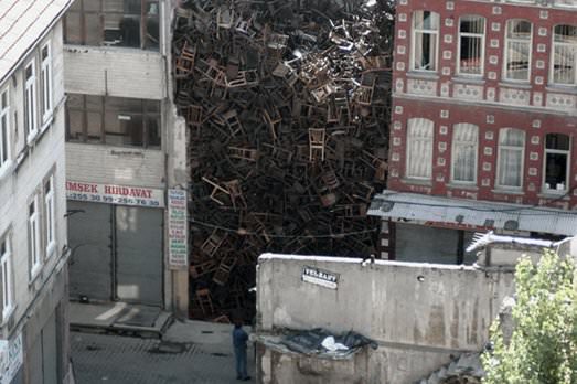 Non è un’installazione di Doris Salcedo, l’artista colombiana che trasforma luoghi e ambienti accumulando mobili e carcasse di mobili. Qui è tutto vero, e siamo a Aleppo, una delle città più antiche del mondo dove, per proteggersi dai cecchini, gli abitanti, quel che rimane delle cosiddette istituzioni hanno accatastato vecchi autobus in verticale.
