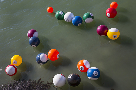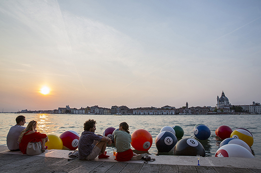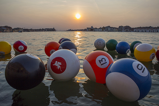 Diciassette boe a forma di palla da biliardo che galleggiano sulla laguna veneziana cambiando continuamente posizione, cullate dalle increspature dell’acqua. Stiamo parlando di “River Pool – Giudecca”, l’ultima installazione di Ottó Vincze (1964), che in occasione della Biennale ha portato a Venezia una versione aggiornata del progetto che aveva presentato la prima volta sul Danubio, nella città di Szentendre, in Ungheria. Ora, l’artista ha aggiunto all’opera due sfere bianche, una con il leone, simbolo della città di Venezia, e l’altra con la croce patriarcale di Szentendre, suggerendo così un parallelo tra le storie connesse di queste due città mercantili e la ricchezza del loro patrimonio culturale, che si sviluppò anche grazie al commercio. L’installazione, inaugurata il 30 maggio tra gli eventi off della Biennale grazie al Centro del Polo Museale Ferenczy e in collaborazione con l’Accademia d’Ungheria in Roma, sarà visibile nel Canale della Giudecca fino al 4 luglio. (NG)