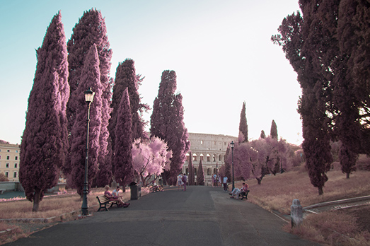 Roma è sicuramente una delle città più fotografate al mondo. Per questo motivo il fotografo ungherese Milán Rácmolnár ha deciso di non sprecare tempo pensando a composizioni o punti di vista differenti per immortalare la città eterna, ma di usare una tecnica fotografica fuori dal comune. Grazie ad una telecamera ad infrarossi, scorci e paesaggi noti della capitale si tingono di un nuovo colore, una forte dominante rosa colora le piante, gli edifici storici, le fontane e i monumenti, sorprendendoci inevitabilmente, e creando una nuova città da guardare per la prima volta. (NG)