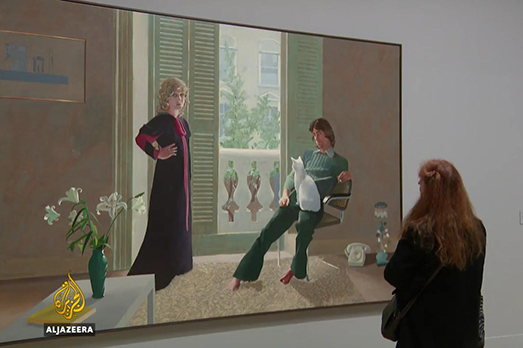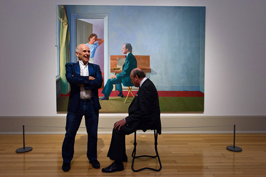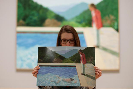Siamo alla Tate Britain di Londra e lei, la donna, è una impiegata del museo dove ieri si è inaugurata una grande retrospettiva dedicata al celebre pittore inglese David Hockney. Il quadro in questione si chiama Portrait of an artist (pool with two figures), (Ritratto di un artista, piscina con due personaggi). E per un curioso gioco di prospettiva ma soprattutto casualità (o ricercata coincidenza?), la scena che si delinea è l’artista che guarda il nuotatore della piscina, guardato a sua volta da un’altra figura.