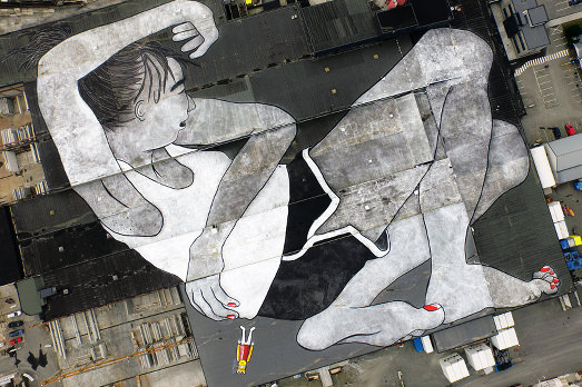 Bella, non è che si possa dire veramente tale. Ma tanta,sì. Il murales – ma la definizione è impropria, visto che è stata dipinto sul tetto di un complesso di edifici – insomma, la donna dormiente, realizzata dal duo francese Ella e Pitr, al momento è la più grande opera di Street Art che si conosca. Per vedere per intero i circa 21mila metri quadrati di cui si compone, ci vorrebbe un aereo. Mentre, se la si avvicina, si diventa tanti lillipuziani.
