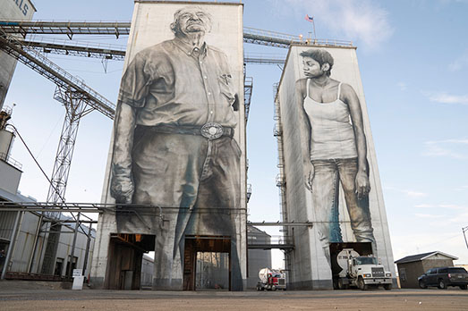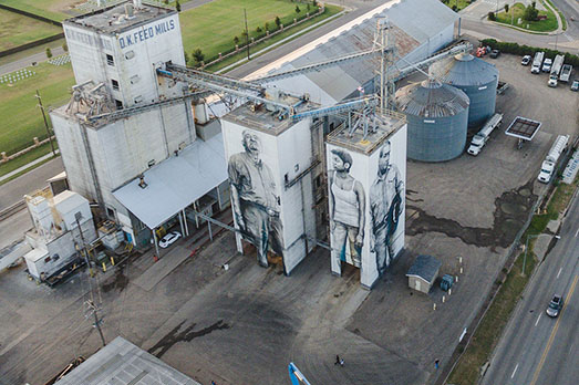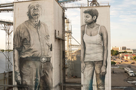 Non è la prima volta che van Helten realizza creature giganti sulle facciate cieche di edifici o complessi industriali a molti piani e ne ha disseminato il globo, ma stavolta ha superato se stesso. A Fort Smith, in Arkansas, sulle pareti altissime di un mangimificio sono comparse tre figure: un nativo della tribù degli Apache naturalizzato Usa, una donna afro-americana, un ex impiegato ora in pensione. Per van Helten rappresentano gli eroi-tipo di questa città ed esprimono il meglio del carattere dei suoi abitanti.
