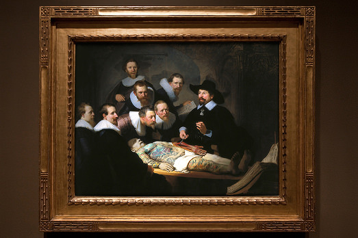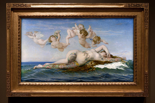 Di chi è l’idea? Di un altro francese: Nicolas Armiad. Artista e designer che si è già divertito a far precipitare (con l’aiuto del fotomontaggio, ovvio) su alcune città macchinari e armamentari di Star Wars. E che ora si è inventato l’Odalisca di Ingres, il Bacchino di Caravaggio, la Dejeuner sur l’herbe di Manet, la Venere di Cabanel, la Lezione di Anatomia del dr. Nicolaes Tulp di Rembrandt e naturalmente la Gioconda di Leonardo, insieme ad altri capolavori della storia dell’arte, con i bei corpi in mostra ricoperti di tatoo.