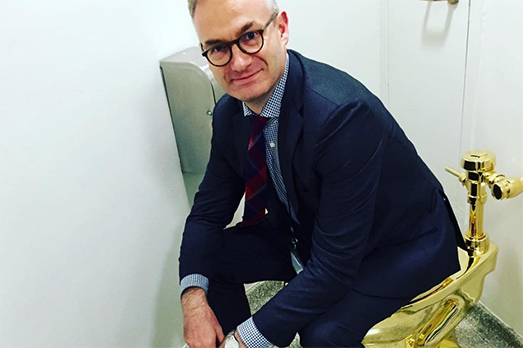 Nessuno ci aveva creduto sul serio. Maurizio Cattelan pensionato era poco credibile, soprattutto dispiaceva. E infatti dopo 5 anni eccolo tornato alla grande, esattamente dove ci aveva lasciati 5 anni fa, e cioè al Guggenheim di New York, museo che aveva già sufficientemente oltraggiato con la sua installazione di opere a pioggia che strapazzavano la sacra Rotunda di Frank L. Wright. E ora ci torna con il suo cesso d’oro, intitolato America.