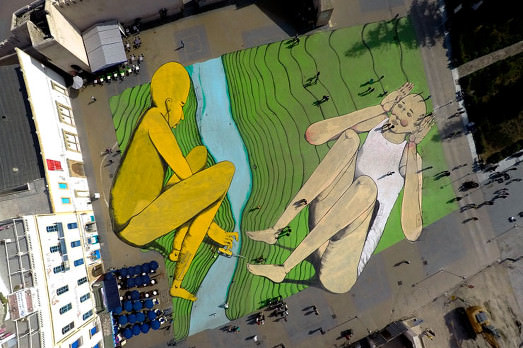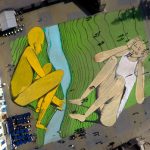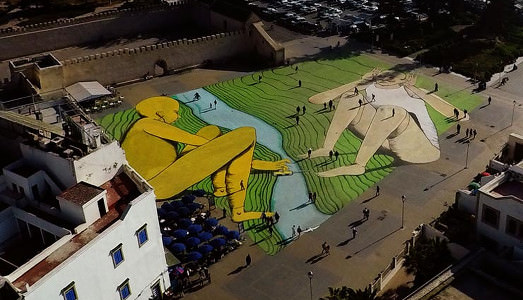 «Potrebbero essere il Messico e l’America, la Cina e la Mongolia», afferma RUN. In realtà, come ammette lo stesso Giacomo Bufarini, vero nome dell’autore italiano di base a Londra di questo enorme opera di Street Art, «non posso non pensare all’Europa e all’Africa». Divise da un mare e che nel suo lavoro prendono l’aspetto di due persone che comunicano attraverso la musica. Oltre a questo risvolto poetico, Les Rives è la più grande opera di Street Art dell’Africa. Già perché il tutto si svolge in Marocco, in occasione della Biennale di Marrakesh, che quest’anno ha un fitto programma di Street Art.