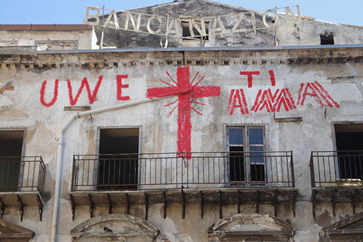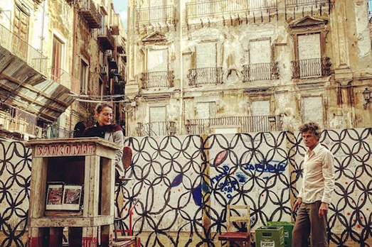 Un artista austriaco, 18 anni fa, non so se per scelta o per destino, incontrò la città di Palermo. Precisamente la Vucciria. Ancora più precisamente Piazza Garraffello: un insieme di ruderi e palazzi dal passato glorioso, ormai inginocchiati all’incuria e all’abbandono. Pare che quel giorno, tra Uwe Jaentsch e quella piazza, accadde qualcosa. Che cosa di preciso non lo so. Forse si innamorarono, forse semplicemente si adottarono a vicenda. È sicuro però che decisero di accudirsi. L’artista trovò muri che presto iniziò a chiamare casa e, soprattutto, uno spazio inusuale per la sua arte. Piazza Garraffello aveva finalmente trovato qualcuno che gli aveva dato un nuovo senso e una nuova bellezza. Inizia così uno dei progetti artistici più sinceri e belli in cui mi sia mai imbattuto. Roba che a descriverla ci vorrebbe uno molto più bravo di me! Per darvi comunque un’idea della bellezza di tutto questo, basta pensare al tempo. Perché è li che sta la meraviglia. Il tempo. Tutto il tempo necessario a trasformare lo spazio in arte: anni e anni in cui Uwe è intervenuto sulle strutture circostanti, creando una realtà alternativa, fatta di “cattedrali” edificate ricomponendo la spazzatura, di banche e di negozi che non esistevano più fino al momento in cui l’artista non ne ha ricostruito le insegne, di facciate ricondotte alla bellezza dal gesto pittorico. La piazza diventa cantiere di un restauro che non si avvale di cemento e progetto architettonico ma di vita e pensiero artistico. Vi giuro: una meraviglia.