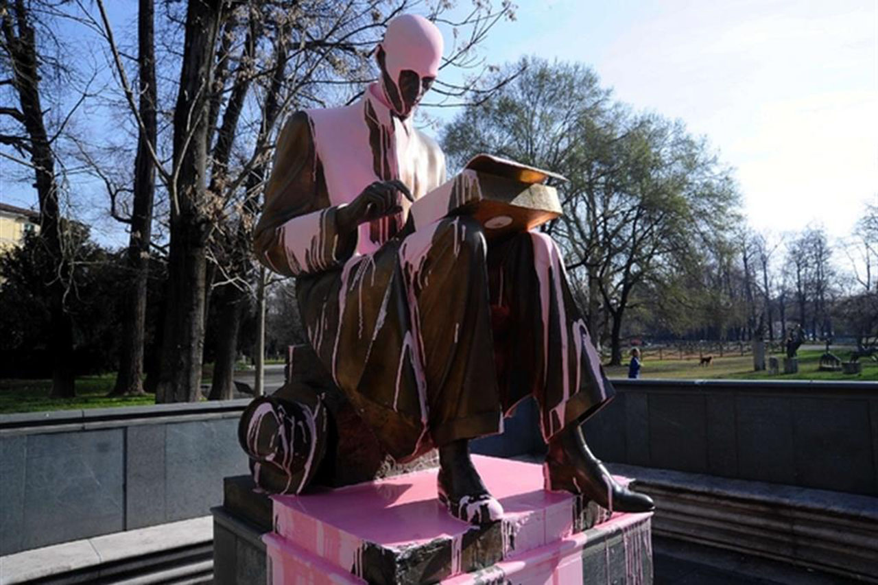 Certo, la pratica di imbrattare – o menomare – statue è arte antica, violenta o ironica. I Buddha di Bayman abbattuti dai talebani, le statue mariane distrutte nelle chiese francesi, le effigi di Cristoforo Colombo decapitate o ricoperte di sangue durante i Columbus Day, le centinaia di statue di Marx e Lenin rovesciate in tutta l’ex Unione Sovietica dopo il 1989. Ma anche le simpatiche coloriture da Capitan America, Ronald Mc Donald, Superman e Santa Claus dei soldati sovietici ritratti nel monumento celebrativo a Sofia, fino alla Sirenetta di Copenaghen imbrattata di rosso per ricordare la sanguinosa caccia alle balene.