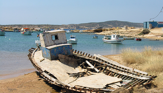 Anche il reperto nel quale mi sono imbattuto quest’estate sa indicarci quanto uno sguardo allenato possa scorgere la bellezza nelle situazioni più diverse senza il bisogno di recarsi per forza in gallerie e musei, dove la sensazione al contrario è sempre più spesso quella del deja-vú, del logorio delle pratiche e di aspettative sovente disattese. L’icona in questione si trova in un suggestivo porticciolo di pescatori a dieci minuti dal paese di Koufonissi nell’omonima, splendida isola dell’arcipelago cicladico. Quel fantasma di barcone emana ancora un olezzo di gasolio misto a marciume, un’alchimia consueta in porti e rimessaggi. Fantasticare di quando, in condizioni non dissimili ma temporalmente invertite, andava vedendo la luce in qualche cantiere navale, quindi immaginarlo mentre fiero solcava le onde con i gavoni stipati di pesce, è stato tutt’uno con il cordoglio nei confronti di un essere a suo modo mitico e che ha vissuto per chissà quanto tempo. Mi ha fatto venire in mente, anche, la carcassa di un animale spiaggiato, di un balenottero o qualcosa del genere. Impressionante è la sua somiglianza con una carcassa in decomposizione, l’immagine tangibile di un medesimo logos che informa natura e cultura è valsa ai miei occhi più di tante opere d’arte.