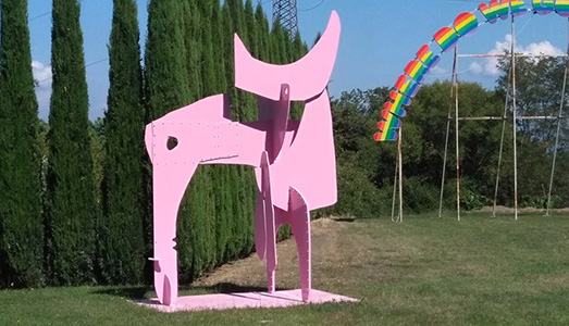 La collezione è situata in annesso della tenuta della famiglia Lauro in Umbria. Un arcobaleno al neon dell’artista Ugo Rondinone accoglie i visitatori nel giardino, chiedendo: Where do we go from here?
