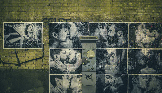 I manifesti sui muri, in città, non fanno quasi più rumore e, specialmente nel periodo delle campagne elettorali, siamo abituati a non soffermarci a guardarli, sapendo già che cosa vogliono comunicare. Ma quante volte possiamo evitare di notare l’immagine di un bacio, quando ce la troviamo di fronte? Lo stesso momento in coppie diverse, ripetuto eppure unico, emerge, vivo e reale, dalle foto che sono state affisse in queste ore sui muri di alcune strade di Roma: una serie di manifesti che appare come una gigantesca pellicola fotografica srotolata sul muro, in bianco e nero, dove vengono ritratte coppie gay, etero, e una donna, sola, che inaugura, e forse genera, la sequenza. Così, questo percorso fatto di immagini appare, tra le altre vie, anche sulla trafficata via Tiburtina nel quartiere San Lorenzo, lungo le mura di Villa Mercede, svoltando poi in via dei Marrucini, divenendo parte del contesto urbano, tra graffiti, immagini sacre, negozi e locali in piena attività.