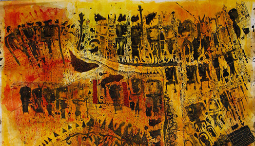 Potremmo dire che l’atteggiamento verso la creazione in questo caso è come un “lasciarsi”. La disposizione d’animo impedisce alla mano di rallentare su lungaggini prospettiche, nessuna resa artificiale della luce, tutto è dato dall’accoppiamento dei colori tra loro. Nel caso specifico di Azema, tre toni, giallo rosso e nero, guidano la costruzione architettonica dei suoi “mondi”, come in una daltonia mistica, che porta letteralmente “fuori” lo spettatore. Fuori della realtà si entra nello spazio dell’opera. Le forme sembrano impresse sul fondo, composto da diverse parti di carta, su cui l’artista ha inciso figure quasi incorporee, vere e proprie tracce in un antro del suo inconscio. Vero è che le figure che vi abitano sembrano convenire con le forme primordiali della caverna. In effetti, la pittura preistorica nacque proprio intorno al fuoco della caverna, giacché era quello il tempo del riposo, della possibilità di essere abbandonati a se stessi, senza il pensiero né d’esser cacciatore né tantomeno preda. Queste tele sono l’attimo lascivo in cui il corpo riposato si apre alle sollecitazioni del mondo, restituendole sotto forma di immagini frugali. La primordialità di questa prassi creativa è ciò con cui Philippe Azema riesce a trovare una dimensione dello spirito, in un percorso simile all’uso dell’arte come mezzo verso l’alterità, verso l’ulteriore, l’oltremodo, come fu agli esordi della storia.
