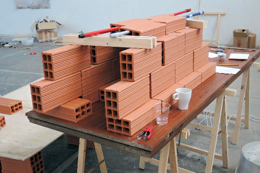Più interno al medium, in un certo senso, è il lavoro di Sortino, interessato ad indagare le scale cromatiche, le reazioni dei pigmenti a contatto con certi materiali (per il lavoro che ha realizzato per la Fondazione si tratta di mattoni edilizi), dove quindi in gioco è primariamente lo sguardo del pittore. Ma anche qui assistiamo a uno sconfinamento linguistico, perché Sortino inizia creando un ambiente, quindi con un lavoro tridimensionale, che poi però “dispiega” a terra rendendolo bidimensionale: una sorta di tela materica dove il colore è steso per vedere che accade e come accade.