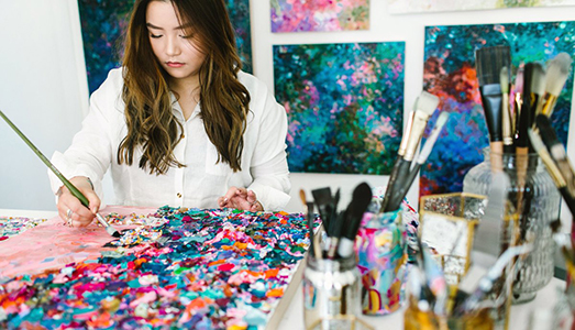 Un mosaico di colori pastosi che fuoriescono dai limiti del quadro e abbracciano chi guarda con mille sfumature diverse. Ogni tassello è il frutto di un lavoro meticoloso fatto di sovrapposizioni cromatiche che occorre osservare nel dettaglio per poi ammirarne l’insieme da lontano. Ingrid and Ching ci invita così nel suo mondo di colori, di fantasia e di passione per la semplicità. Sin da giovanissima legata alla creazione artistica, ha deciso di intraprendere la strada delle belle arti subito dopo il liceo, viaggiando da Hong Kong fino in Australia e infine negli Stati Uniti, dove oggi si trova il suo studio. Con tante idee in testa e un’unica passione, ha lanciato il suo brand, trovando ispirazione in tutto ciò che la circonda. «Ingrid and Ching è un’estensione di me stessa – racconta Ingrid – L’arte mi permette di dare voce alla mia interiorità, laddove le parole finiscono. Questa voce vi spingerà a considerare gli aspetti positivi alla luce di quelli negativi, il tutto senza dire una parola». I suoi quadri sono in effetti un’esplosione di colori e di emozioni, ogni pastoso tassello è un piccolo arcobaleno in miniatura che, sapientemente predisposto, compone quadri frutto di un’attenta analisi della natura e delle quotidianità. «Tutto inizia scattando alcune foto – spiega l’artista – e in seguito unisco le immagini che meglio si adattano a stare insieme e infine inizio la composizione ad olio attraverso la sovrapposizione di diversi colori. Ogni strato ha il suo scopo e il suo significato. A volte aggiungo scaglie di vetro, cristalli e lustrini per esaltarne l’aspetto complessivo. Sono lì per ricordarci che il mondo è ricco di dettagli da scoprire giorno per giorno».