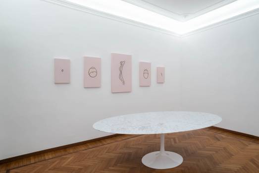 Così Romance di Luca Loreti (1990) rompe il ghiaccio presentando gran parte delle opere della serie #Holes e una scultura inedita, un “volto mostruoso” fatto di compensato dipinto e sorretto da una struttura in ferro. «Nel 2016 ho iniziato a realizzare sia i pezzi rosa che le sculture bidimensionali – spiega Loreti – ed è la prima volta che li presento insieme in una mostra personale. In modo ironico accosto i termini “pittura” e “scultura”, perché obiettivamente i pezzi a parete sono delle sculture mentre la scultura è a tutti gli effetti una pittura su tavola. Questo mi permette di dare un’emotività differente alle opere e di creare una relazione tra loro, fatta anche di dissonanze». In #Holes le superfici a campitura piatta ospitano anatomie minime generate dall’effetto della ruggine sul ferro, metafora chimica che coinvolge il tema della sessualità e quello delle relazioni, in un gioco di rimandi vario, tra Cultura Pop, Manga e tradizione giapponese: «Anche il fumetto americano, quello italiano, i cartoni animati dei primi anni ’90 o quelli anni ’70 e ’80 che davano in replica, le copertine dei dischi che ascolto…Per il ciclo #Holes l’ispirazione tecnica maggiore deriva dal tatuaggio tradizionale americano. La sfida per fare un buon tatuaggio tradizionale sta nel riproporre sempre gli stessi soggetti in modo chiaro e riconoscibile, ma avendo l’ago di una determinata misura. Per realizzare il disegno sulla lastra uso il mio dito, quindi una misura di segno standard. Una volta fatta la linea non posso più tornare indietro, se non ricominciando tutto il processo da capo. La fase di progettazione è molto lunga proprio perché devo realizzare un disegno che possieda meno linee possibili ma la giusta tensione formale». Tensione che dalle singole opere si estende al tutto, al movimento ‘dilatato’ ricreato sulle pareti che diviene precisa scelta allestitiva. Orny fa capolino da un’altra stanza, “in tutta la sua fragilità”, scrive il suo autore, ma solo se alla visione frontale si privilegia quella a 360 gradi.