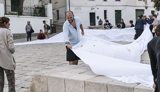 Pare sempre che capitino nel momento giusto le sollecitazioni artistiche di Ruben Montini, specie se l’argomento clou è l’Unione Europea e se ci troviamo in un clima fervido di manifestazioni e agitazioni politiche (il referendum catalano e la risposta del governo spagnolo, ndr.). L’artista sardo, da numerosi anni all’estero, in collaborazione con il Museo MAN, arriva a Nuoro con un progetto ad ampio raggio a cura di Micaela Deiana, e che riguarda proprio l’Europa. “Questo anonimato è sovversivo”, arriva al terzo appuntamento di una performance on-the-road, in piazza Sebastiano Satta: trenta metri di tessuto bianco, che visiterà ogni Paese d’Europa per poter essere rielaborato attraverso il ricamo, dai partecipanti alla performance. Il progetto di Ruben Montini è stato selezionato dal Museo MAN in occasione di Art Verona 2016, nell’ambito del progetto Level 0. Un progetto multiculturale che abbraccia l’Europa, con l’obiettivo di ricordare e riannodare le fila di un’unione che a volte stenta ad essere riconosciuta e amata. E visto che l’occasione era propizia, ne abbiamo approfittato per estendere la chiacchierata sugli elementi più significativi della sua carriera.