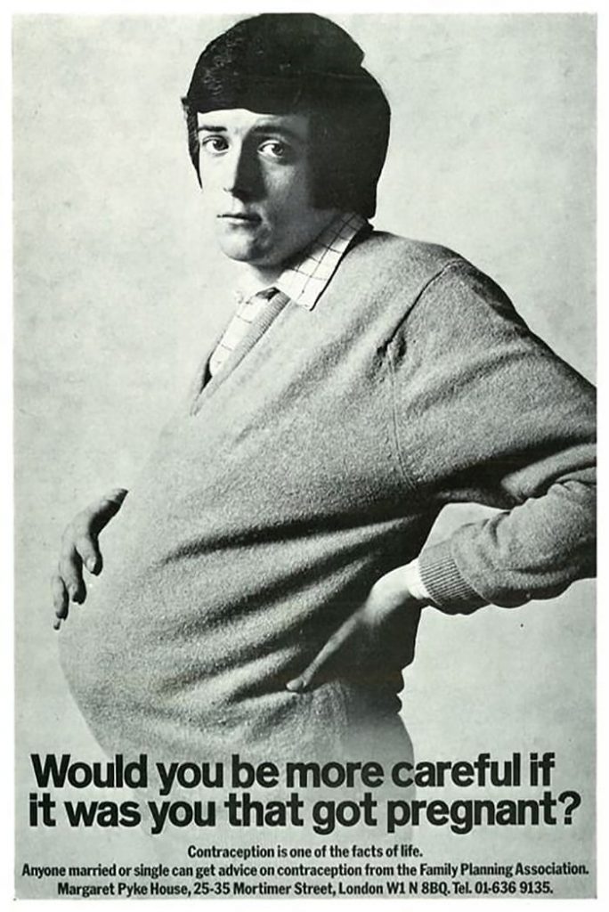 “Saresti più attento se fossi tu ad essere incinta?”. Così recita lo slogan del poster corredato dalla foto di un uomo che posa la mano sulla sua pancia visibilmente gravida. L’immagine di grande impatto sociale era stata creata dalla Saatchi & Saatchi per l’Health Education Council nel 1970. Lo scopo era quello di promuovere maggiore consapevolezza sull’importanza della contraccezione per gli uomini tanto quanto per le donne. Il poster attacca la tradizionale visione della mascolinità, ed infatti fu di forte impatto nella società, tanto da generare forti polemiche all’interno del parlamento britannico.