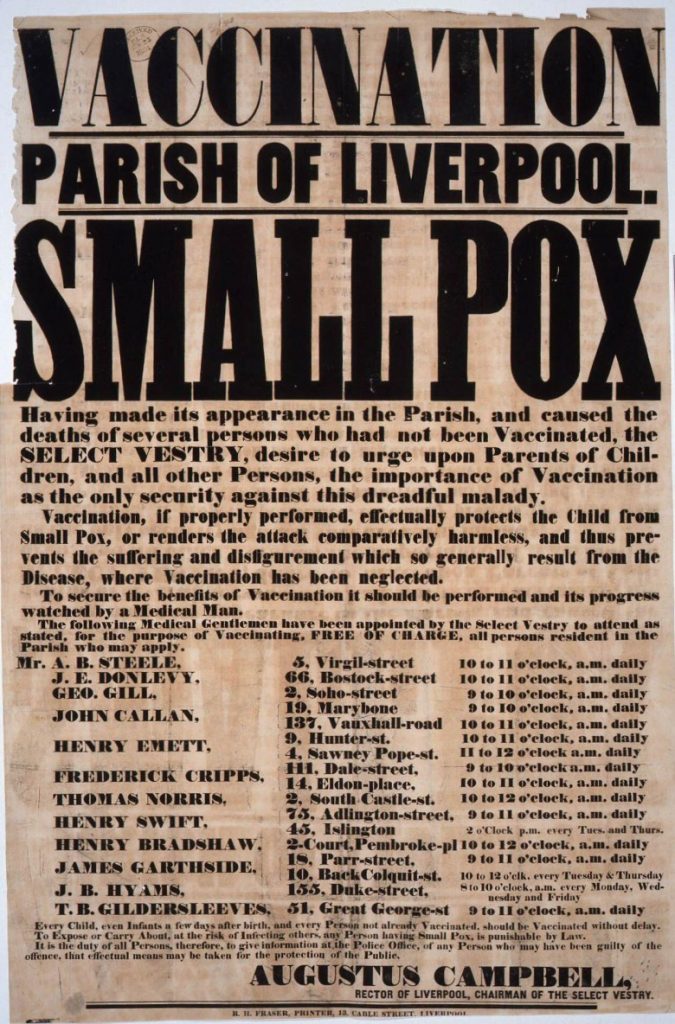 Dall’800, cosi come ai giorni nostri con il Covid 19, i poster sono uno dei media più importanti utilizzati per comunicare messaggi alla popolazione durante le emergenze sanitarie. Provocando ben 400.000 decessi all’anno nel XVIII secolo, il vaiolo era la maggiore causa di morte in Europa. Nel XIX secolo, il governo britannico, fece una campagna per spingere la popolazione a vaccinarsi contro il vaiolo a seguito di varie proteste di gruppi che credevano che il governo stesse limitando la loro libertà ed autonomia spingendoli a violare l’obbligo di vaccinazione. La campagna funzionò portando a sconfiggere definitivamente il vaiolo nel mondo nel 1977.