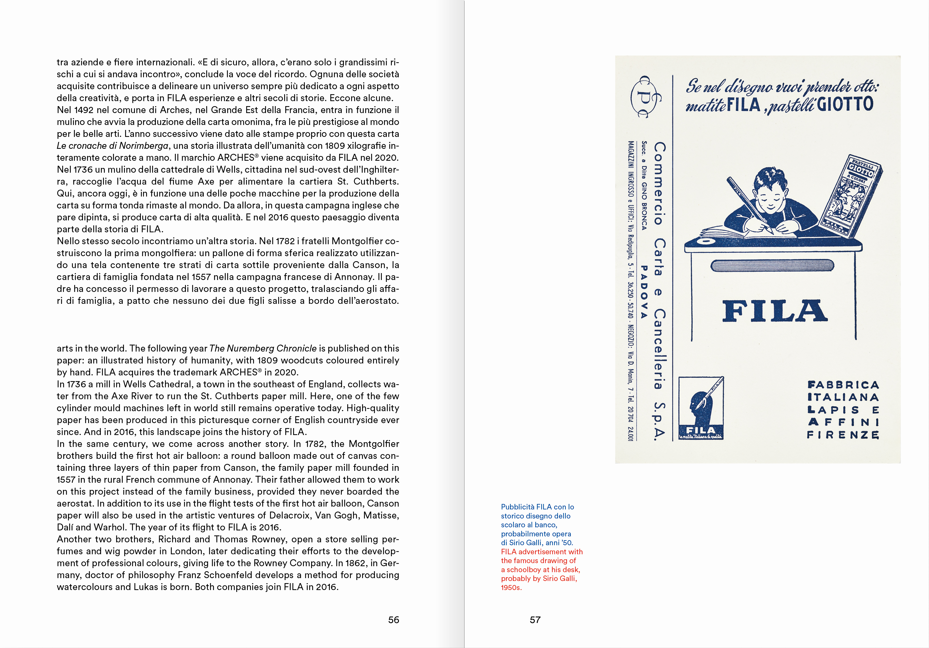 A impreziosire ancor di più il volume è la carta sui cui è stampato, anch’essa uno dei marchi Fila. La carta per le belle arti Canson, nata 450 anni fa nella campagna francese di Annonay. La carta è stata utilizzata dalla famiglia Montgolfier per le prove di volo della prima mongolfiera e da artisti come Eugène Delacroix, Vincent Van Gogh, Henri Matisse, Salvador Dalì e Andy Warhol.