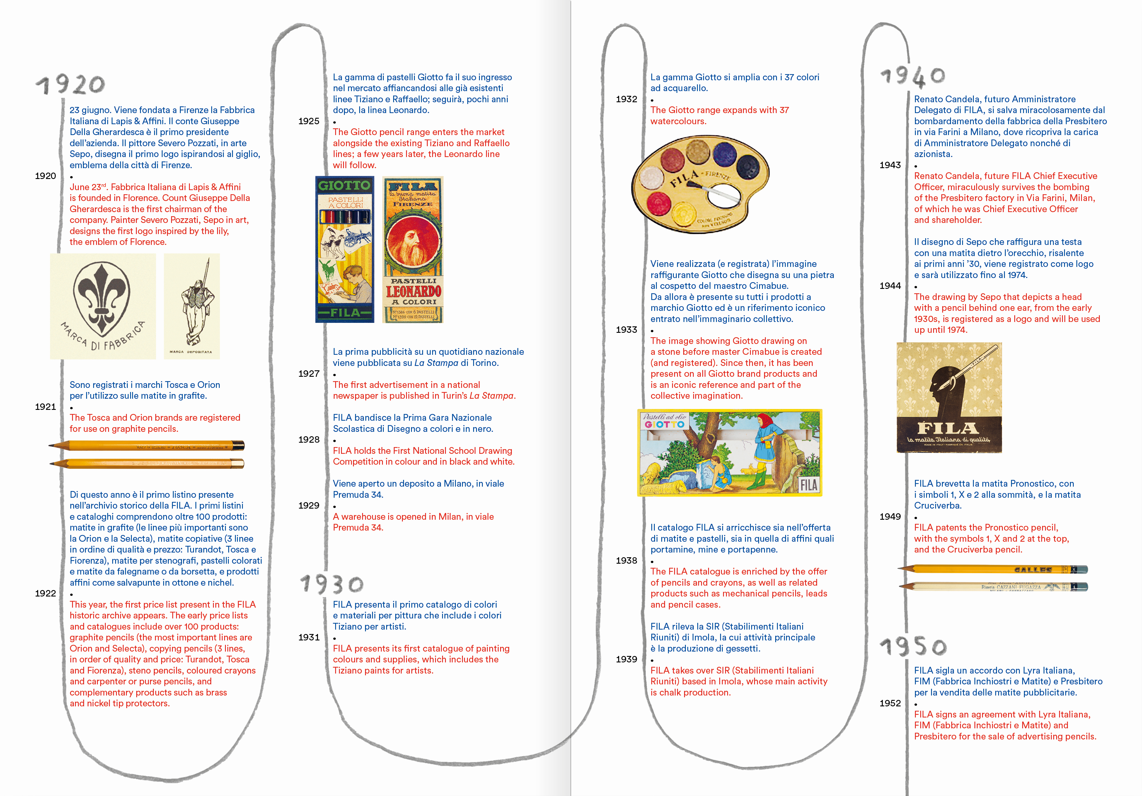 La storia di Fila (acronimo di Fabbrica Italiana Di Lapis & Affini) inizia il 23 giugno 1920 quando l’azienda venne costituita a Firenze, su iniziativa di un gruppo di imprenditori capeggiati dal Conte Giuseppe della Gherardesca. Da quell’estate sono trascorsi cento anni e le aspettative dei fondatori «di fabbricare e commerciare lapis, oggetti e articoli di cancelleria e di durare per 50 anni», sono state ampiamente superate…arrivando a festeggiare quest’anno il centenario della sua nascita.