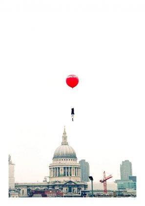 Girl With Balloon Tate Installation, una bambola gonfiabile riempita di elio e lasciata volare con un palloncino (Courtesy: Steve Lazarides) -