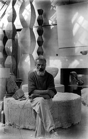 Innanzitutto le forme, vibranti di luce e di vita: l’ovoide delle Muse, il dente di sega del Gallo, i romboedri impilati della Colonna senza fine, gli slanci sperticati degli Uccelli, i piedistalli assemblati che avranno un’ascendenza sulla Minimal Art americana. Poi le materie, direttamente intagliate: dalle fibre del legno alle venature del marmo, dalla pietra sgrossata al bronzo opaco, lucidato al punto da riflettere (e confondersi con) lo spazio circostante. Infine i luoghi: il parco simbolico di Tirgu-Jiu in Romania (precursore della scultura ambientale), con la Porta del Bacio, la Tavola del Silenzio, una colonna di trenta metri; l’atelier di Impasse Ronsin (ricostruito nel ‘97 davanti al Centre Pompidou), elettrizzato dalla polvere come la grana delle sue foto, luogo eletto di esposizione – a sentire i suoi critici, un cantiere, un tempio, una caverna, un panificio con i forni ancora caldi.