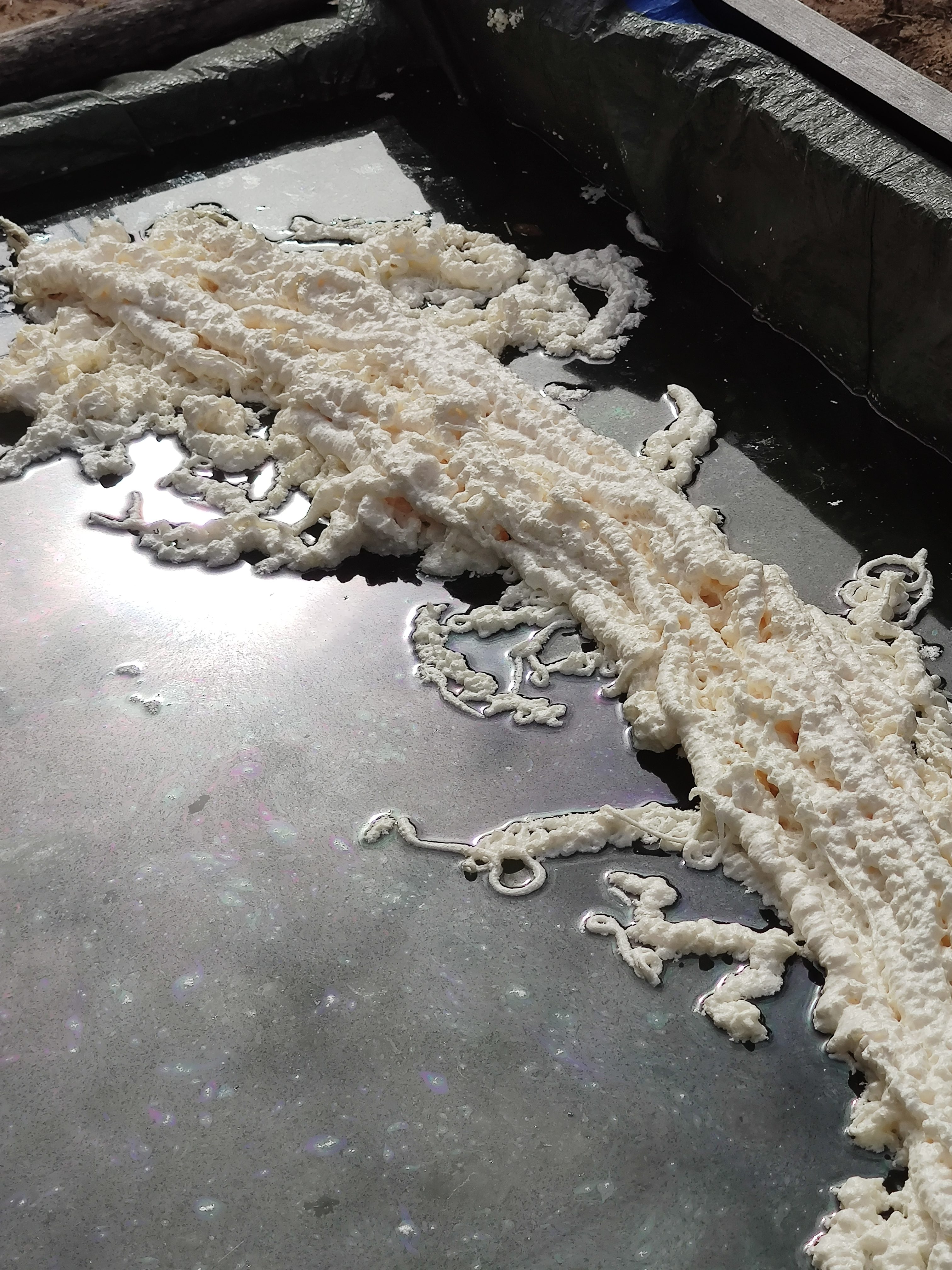 L’abbandono di Biggio alle incognite trasformative della materia e della natura è sottolineato nel saggio di Marta Papini, Senza rete di protezione. Ogni opera inizia con un esperimento di cui l’artista non conosce il risultato finale: realizzare sculture di sola cenere e acqua (come nelle serie Sénne, 2018-in corso e Coni di Cenere, 2010-in corso), lasciando campo all’aria e all’umidità di agire e scegliere la riuscita oppure il disfacimento della forma data, ancor di più far manipolare il poliuretano espanso dall’acqua, rendendolo soggetto a imprevedibili fluttuazioni (Schiume, 2021).