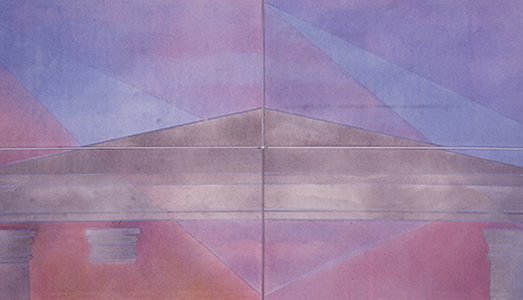 Eppure c’è un OLTRE, nell’umana esistenza, che non può essere unicamente racchiuso o contenuto nelle forme, talvolta algide, della geometria. Avanzando nella sua ricerca artistica Annamaria Gelmi sembra suggerirci che accanto al pensiero razionale si pone quello mistico- metafisico. Dallo spazio fisico e misurabile, allo spazio interiore come nell’opera “Attraverso l’infinito del cielo” del 1984. L’eterea sostanza del noetico si sposa con l’impalpabile presenza dei pigmenti. Pare dunque che l’artista nel suo lungo cammino viva proprio l’antitesi tra il fuori e il dentro, tra il concreto (il qui ed ora della materia) e la dimensione impalpabile della coscienza evocata dalle trasparenti velature degli acquerelli su carta di seta giapponese, successivamente intelata. Tutto ciò in apparente contraddizione con la fase precedente, se non fosse che la geometria predispone più di ogni altra cosa alla metafisica che si struttura di altre coerenze, di un altro modo di sentire e pensare. Una nuova apertura, quindi, che implica la dimensione dell’intuizione attraverso la presenza del colore che l’artista sperimenta su tela e su carta di seta giapponese. Il suo, a un tratto, è un viaggio iniziatico, mistico-metafisico, retto dalla presenza costante del disegno, dall’interesse per l’architettura che rimane il principio regolatore dell’organizzazione formale di tutte le opere. Le sue grandi sculture negli spazi aperti e chiusi ne sono una limpida testimonianza. Attraverso i temi della croce, dei labirinti, delle porte e perimetri l’artista sperimenta il passaggio più delicato che si possa compiere nel percorso esoterico dell’arte: vale a dire la tramutazione del reale e del mondo interiore in simbolo. Per compierlo bisogna portarsi oltre la soglia che “altro non è – come afferma il filosofo Franco Rella citato da Katia Fortarel- che il limite tra il mondo sensibile e quello spirituale”.