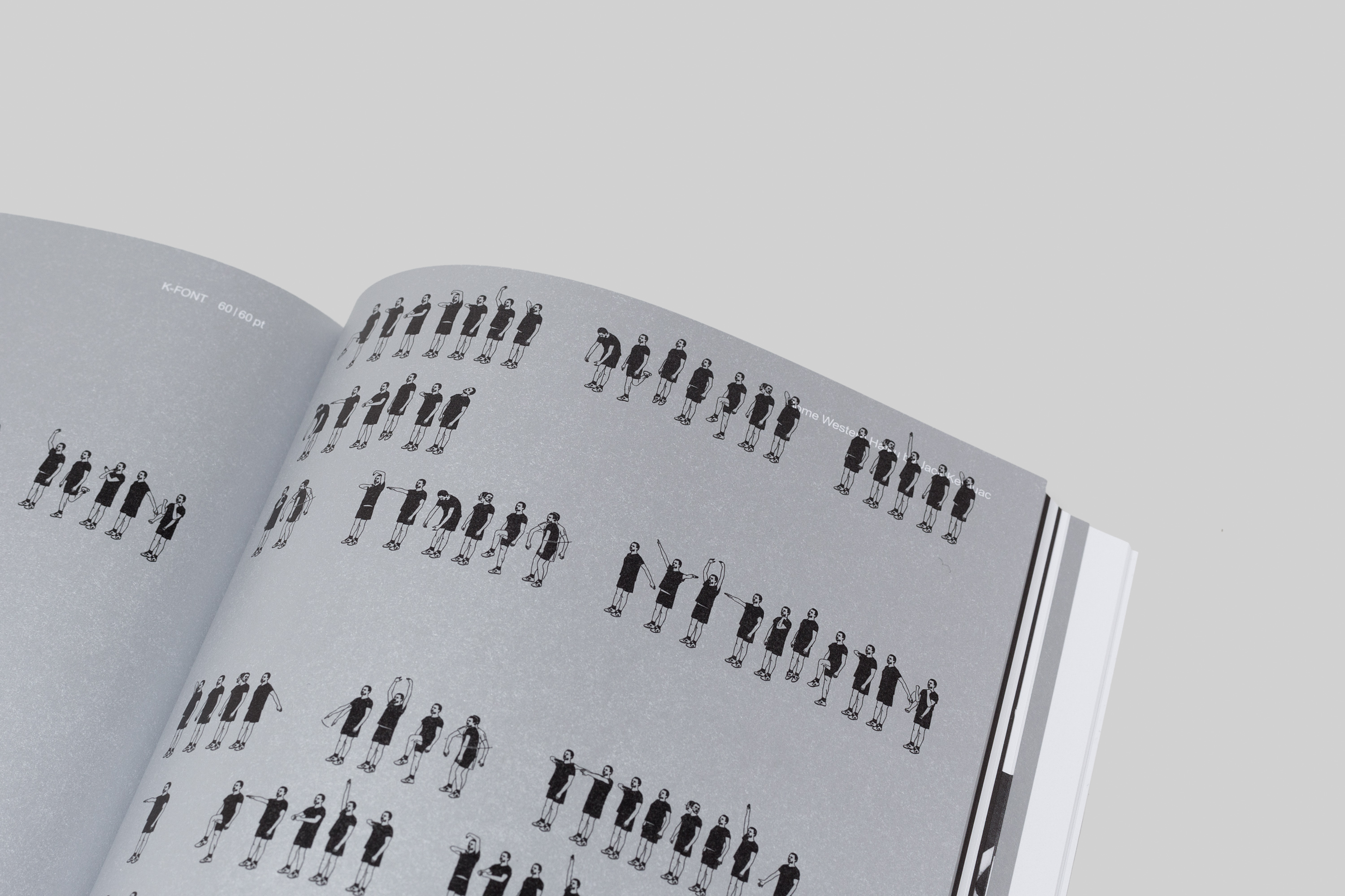E, proprio come in alcuni riusciti libri gioco, il suono è suggerito e scaturito dall’intima relazione che il lettore innesca con l’oggetto libro, qualcosa che sembra estremamente silenzioso contiene più suono che mai. Non a caso proprio di libro gioco parla Cristina Ventrucci nell’introduzione a Ada, il libro quadrato citato in apertura, perché è solo con un ritorno a qualcosa di infantile, e quindi antecedente alla lettura (in quanto decodificazione di parole) che qualcosa di non raccontabile come ciò che avviene in scena può trovare un modo di essere trasmesso. Le immagini in bianco e nero grazie a un colore argento, bellissimo, va detto, cercano la tridimensionalità, di uscire fuori e farsi carne, di sfondare la pagina come si sfonda la quarta parete. Avere a che fare con un libro è come avere a che fare con un corpo, non si può eludere la sua matericità, bisogna sfogliarlo tenerlo in mano, annusarlo sentirlo respirare accanto a se. E in particolare questo All for All! È tutta una faccenda di corpi. Racconta un progetto che Kinkaleri ha portato avanti dal 2012 al 2016, a partire dalla figura di William Seward Borrougs (autore vicino alla Beat generation, conosciuto per il romanzo La scimmia sulla schiena) e che ha creato nel tempo percorsi verbali, fisici, visivi e sonori. Ma l’atto fondante di All!è stato quello di inventare un codice gestuale, il codice K, che trascrive il simbolo alfabetico sul corpo, travalicando la parola e l’idea stessa di coreografia. Codice che è arrivato ad avere un proprio font, il K-font, presente anche nel libro, realizzato nel 2014 con Giacomo Covacich e Bruno.