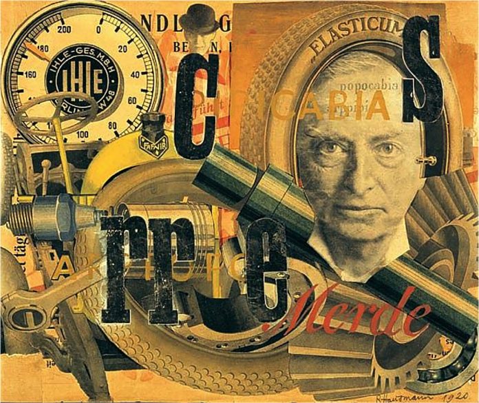 Il Dada berlinese, come è noto, invece tenderà a decostruire la macchina. Personaggi come George Grosz, John Heartfield e Raoul Hausmann spezzeranno radicalmente le pretese di un’idea tradizionale e spirituale dell’arte in un mondo che andava a strutturarsi sulle funzioni delle macchine. Con loro ritorna, a corrente alternata, il rapporto dicotomico amore-odio nei confronti della scienza e della tecnologia: come si evince nel fotomontaggio Elasticum realizzato nel 1920 dallo stesso Raoul Hausmann il quale, tra immagini e parole, opera un vero e proprio sconvolgimento strutturale e sintattico. Dunque distacco, nei confronti della “cieca fede nelle scienze” e, in Grosz, amara ironia verso i disastri della guerra.