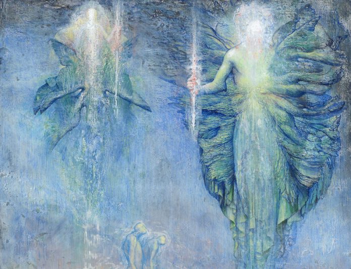 Non vorrei svelare ancora troppo; mi piacerebbe conservare l’effetto sorpresa per l’osservatore/lettore che potrà ammirare le tavole una volta stampate e trovarne punti di coesione stilistica e di totale innovazione rispetto alle mie precedenti opere. Posso raccontare qualche espediente già reso pubblico. L’immagine del canto dedicato a Piccarda Donati e Costanza d’Altavilla fu l’occasione di fare miei dei registri nuovi e di intraprendere un balzo visionario: la luce è il valore che va a definire i canti del Paradiso in un crescendo di verticalità abbacinante. Nel Paradiso la memoria terrena e anatomica va estinguendosi a favore di trasparenze vitree, lattee e madreperlacee; perciò mi sono avvicinato ai colori delle pietre delle opali e ho costruito la tavolozza per sottrazione di colore, virandolo nelle sfumature più infinitesime. Poi mi sono concentrato sulla nebbia translucente che avvolge gli spazi siderali e che vela i colori similmente alla tecnica divisionistica, con piccoli tratteggi delicatissimi che si accostano (e non si miscelano) come nella scomposizione nella retina dell’occhio. La simmetria e la geometricità che caratterizzano il percorso dantesco nel Paradiso mi hanno permesso di utilizzare la tecnica dello sdoppiamento rifratto delle immagini, che già in passato ho impiegato in altre mie opere e che ho adoperato anche per alcuni dettagli delle altre due cantiche.