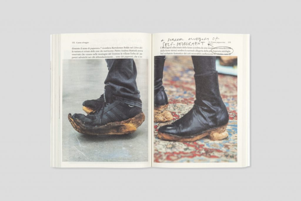 Il libro segue il flusso di coscienza di Trevisani, in un intreccio tra il suo pensiero, le immagini delle sue sculture di pane e l’edizione de Il Pane Selvaggio, ripubblicata dalla casa editrice Il Mulino nel 2016. Le sue masse di farina, acqua e sale prendono la forma di calzature così come accadeva al pane distribuito ai poveri disperati nell’Italia centrale durante il Medioevo, impresso con lo stemma delle famiglie benefattrici. Le scarpe di pane, generando un sentimento ambivalente di attrazione e repulsione, diventano un simbolo mutevole di povertà, di eccesso e di abbondanza, incline ad assorbire – come un database – le informazioni culturali della società. Celebrando il potere e la saggezza del pane, i “walking totem” di Luca Trevisani si configurano come opere dedicate alla memoria, all’identità e alla storia.