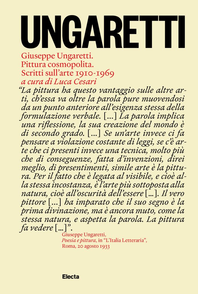 Oggi, il corpus di riflessioni sull’arte visiva che Ungaretti ha prodotto sull’arco di 60 anni trova finalmente una forma sistematica nel volume Pittura cosmopolita. Scritti sull’arte 1910-1969, a cura di Luca Cesari, in uscita il 14 aprile per la collana Scritti di Electa.