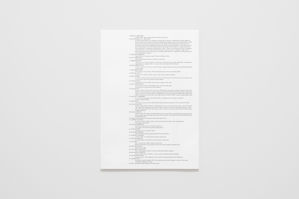 I due curatori hanno disseminato la casa di storie, oggetti, voci, performance, indizi di vari artisti dal mondo. All’interno della casa troviamo, per esempio, due copie del Proposal for Monuments and Buildings di Claes Oldenburg, disposte insieme ad altre letture, quasi fossero manuali consultati dallo stesso Plečnik. Pennelli e penne sono incastonati nella creazione di ceramica dell’artista Manfred Pernice, posta sulla scrivania, tra righelli, squadre ed inchiostri utilizzati dall’architetto per realizzare gli schizzi dei suoi più famosi progetti. Un semplice studio diventa il laboratorio di un alchimista.