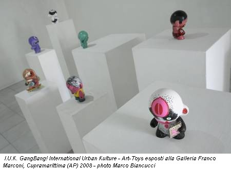 Ultimo appuntamento della stagione Con te o senza di te della galleria marchigiana, I.U.K. GangBang! è organizzata in collaborazione con “La Repubblica XL” e la Galleria Mondo Pop di Roma. Alle pareti un’opera per ogni artista e, al centro dello spazio, gli Art-Toys personalizzati dagli stessi autori. Materializzazione di idee finora appartenute unicamente alla carta, questi pupazzetti sono stati proposti in occasione di Lucca Comics, nel novembre scorso, in Toys in Xland. Successivamente hanno fatto la loro comparsa nella galleria romana. L’arrivo alla Galleria Marconi, ambiente sensibile ma non legato a un tipo esclusivo di figurazione, legittima questo mezzo, sottolineandone lo scarto intrinseco verso la virtualità.