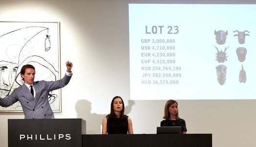 Phillips apre le danze, trainata dal risultato delle dodici teste di animali in bronzo, opera di Ai Wei Wei, Circle of Animals/Zodiac Heads, del 2010, che rappresenta i segni dello Zodiaco tradizionale cinese, venduta a 3,4 milioni di sterline. Phillips così fa superare il suo stesso record all’artista e dissidente cinese, che nella stessa casa d’aste lo scorso febbraio con la stessa opere, placcata in oro, aveva raggiunto i 2,9 milioni.