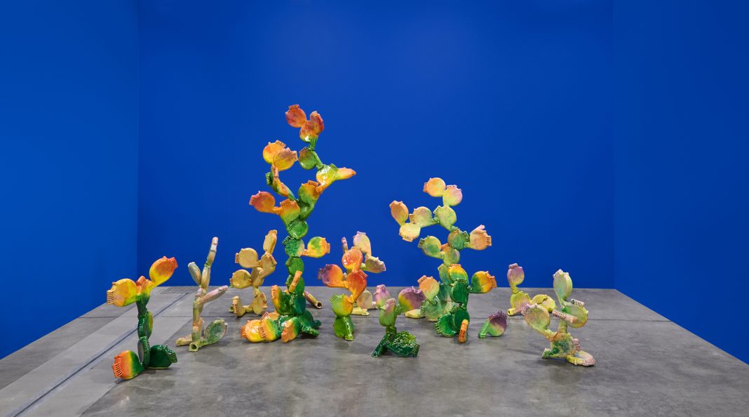 A proposito di artisti contemporanei. Nella Emergent Section, da ArtNoble, c’è il gruppo di sculture Kit eliminacode multifunzione di Luca Staccioli – di fatto, dei fichi d’india in ceramica, come totem, ma ispirati ai dispenser dei ticket del supermercato (prezzi da € 3800 a € 18.000). «Non hanno ovviamente un’utilità, ma denunciano l’accumulo e la disumanizzazione del capitalismo», spiega il gallerista Matthew Noble. Hanno attirato l’attenzione dei collezionisti, con prezzi compresi tra € 3800 e € 18.000. Anche Raffaella Cortese, nella sezione Established, punta l’attenzione su un unico artista nel suo booth decisamente minimale; e trova subito un nuovo proprietario l’altalena di Francesco Arena, in effetti, l’avevamo già vista all’edizione 2022 di Italics (è un’edizione da 3 + 2 prove d’artista), con una lastra in bronzo e la frase “Tutti i giorni presenti si assomigliano, ogni giorno passato è diverso a suo modo” che fa il verso all’incipit nefasto di Anna Karenina. «Quando qualcuno utilizzerà l’altalena, coprendo con il corpo le incisioni», dice l’artista, «la farà risuonare ripetendo la frase ad alta voce». Il booth è affollato fino alla fine, non di opere, ma di visitatori, rende bene l’idea dell’opera interattiva. Il prezzo: € 35.000.