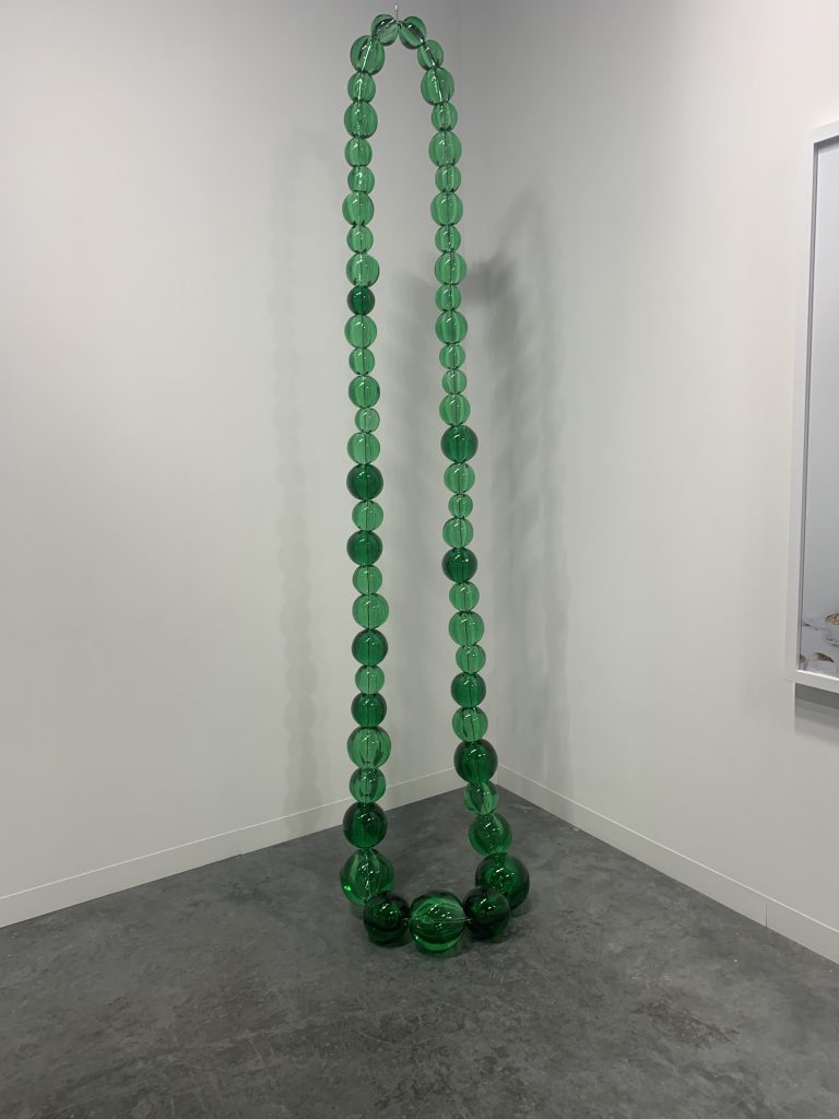 Con curiosità ci avviciniamo allo stand della galleria Perrotin la cui storia interessante ha come fondatore un giovane ventunenne Emanuel Perrotin. Nell’Art Basel Miami del 2019 fu particolarmente frequentata, fotografata e criticata per la scultura in mostra di Maurizio Cattelan Comedian con una banana attaccata al muro con un adesivo grigio. Ora porta in mostra energia pura di Emma Webster, un divertente Emily Mae Smith con la sua Embrace scopa amorfa e Jean-Michel Othoniel con una lunga enorme collana di giada, ma il tempo delle banane è dunque concluso o forse no. Le ritroviamo protagoniste nel dipinto di Antonio Henrique Amaral intitolato Battlefield del 1973 ,ad olio, dove il frutto appare grossolanamente ingrandito su tele di 1 m che si attorcigliano ingiallendosi ai lati. Banane, coltelli e una corda che li unisce, metafora di 2 realtà, 2 mondi, 2 identità. Affrontando lo spinoso tema del colonialismo. Non a caso l’opera è esibita dalla galleria Kuczynsky di S. Paolo nel settore Survey, incentrato sulle presentazioni storiche e sulle denunce sociopolitiche.