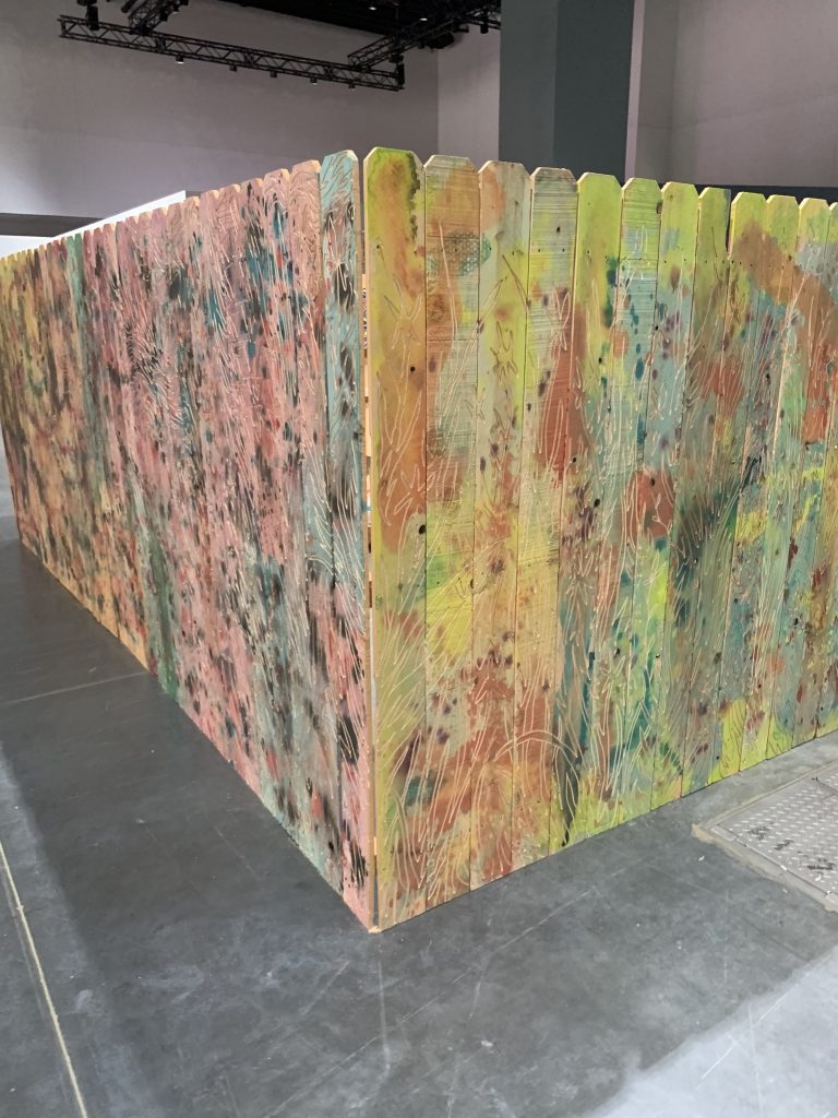 Due le opere particolarmente affascinanti. La prima dell’artista Ebony G. Patterson, presentata dalla galleria Monique Meloche fondata a Chicago nel 2001 proponendo artisti locali e internazionali emergenti e promuovendo un’arte politicamente orientata. L’opera ciclopica con 18.3 m dal titolo bizzarro …e la rugiada spacca la terra, in 5 atti di lamento…tra, tagli…sotto le foglie …sotto il suolo… si compone di 5 grandi contenitori dalla cornice bianca, ciascuno decorato con finti fiori, piante e insetti, arti umani e torsi di donne nere senza testa per sottolineare e denunciare una violenza razzista. Interessante l’opera dell’artista libico Yurok Saif Azzur presentato dalla Galleria Nicelle Beauchene. La particolarità di questa installazione è che appare come una corte chiusa, recintata da pannelli. Le opere sono appese all’interno e al centro vi è una scultura che si intravede solo tra i buchi e le separazioni del recinto. Il visitatore avverte di essere indesiderato, intruso, e vive l’esperienza dell’essere escluso emarginato, reietto. Forte messaggio di denuncia verso i privilegi, il colonialismo e la forza combattiva di sopravvivenza degli indigeni.
