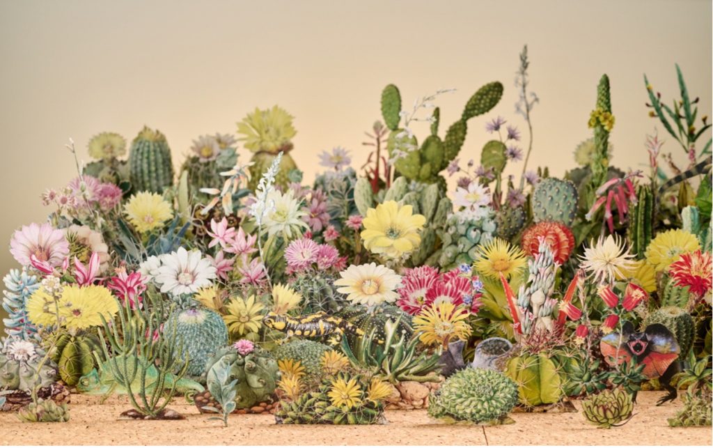 FOST Gallery at ART SG. Donna Ong, Every World (Desert), 2019. Medium: Paper (handcut), watercolour, wire, cork, glass and wood. Dimensions: 180.6 x 65.6 x 43.8 cm